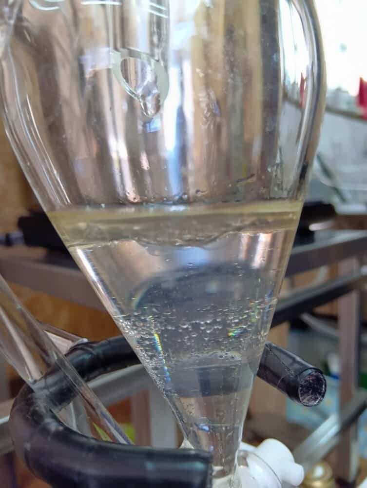 ↑の液体が2層になっているのが分かりますか?量の多い液体が、蒸留水。上の層がアロマオイルです。