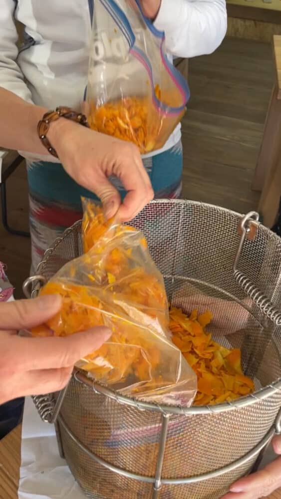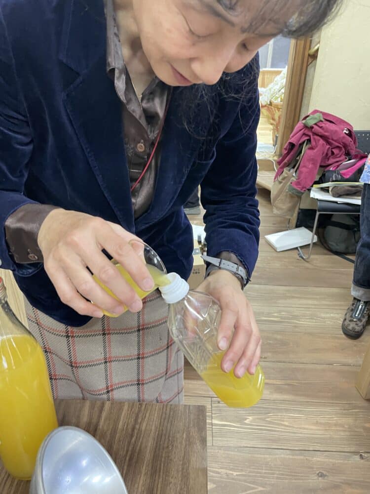 出来上がった少量(でも割と多くできた)橙のアロマオイル、事前準備で皮をむくときに絞っておいた橙の果汁もお持ち帰りいただきました。